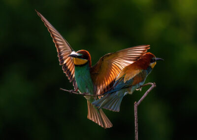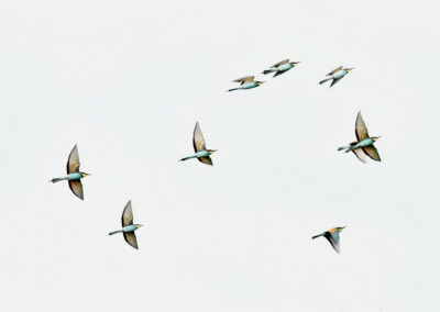 Op de laatste dag mogen we zelf kiezen wat we willen herhalen. Ik kies opnieuw voor de bijeneters. Dit keer ben ik alleen in de hut. Het licht is lastig, maar ook prachtig door de sluierbewolking. Ik experimenteer wat met tegenlicht en ben blij met het resultaat. In de middag volgt een gezellige en leerzame fotobespreking en zie ik de prachtige foto’s van mijn mede reisgenoten die op hun manier ook geweldige ervaringen hebben gehad. Daarna nog één keer naar de hop. Het wil niet meteen lukken, tot ik ontdek dat mijn teleconverter er nog op zit. Een beginnersfoutje die ik na zo’n intensieve week makkelijk maak. Gelukkig krijg ik nog een paar mooie kansen.