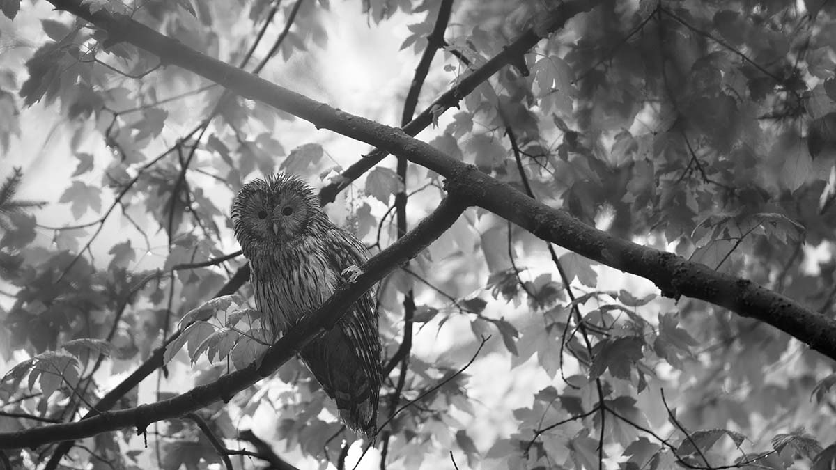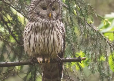 De volgende dag splitsen we de groep op in twee auto’s en trekken de bergen in. Het is mistig en wat miezerig, en de hoop op goede waarnemingen slinkt hierdoor wel wat. Toch zien we in de ochtend kort een Oeraluil, al blijft het bij een waarnemingsfoto. Na een warme lunch in een lokaal restaurant keren we terug naar dezelfde plek. En dan hebben we geluk: een Oeraluil vliegt aan en gaat op een tak dichtbij zitten. Ondanks de mist kunnen we hem prachtig vastleggen. Even later, op een andere locatie, komt hij nóg dichterbij. Ditmaal bij beter licht. Een absoluut hoogtepunt.