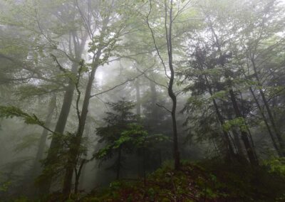 Een dag later staat er een bijzondere ontmoeting op het programma: de auerhoen. We rijden naar een berggebied bij Luče. Na een stevige klim – waarbij sommigen van ons even flink moeten uithijgen – bereiken we het leefgebied van deze indrukwekkende vogel. Vooraf zijn we gewaarschuwd: deze jongen heeft temperament en duldt geen inmenging in zijn territorium. En inderdaad, nog voor we goed en wel staan, komt hij al dreigend op ons af. We moeten een paar keer achteruit stappen om hem niet te provoceren. Maar wat een ervaring! Hij paradeert door zijn territorium alsof hij weet dat hij gefotografeerd wordt. Op veilige afstand maken we prachtige beelden van deze imposante soort. Na afloop lunchen we in een knus restaurantje in het dal. In de middag proberen we nogmaals de Oeraluil, maar de mist is weer spelbreker. Gelukkig hebben we de auerhoen vers op de kaart.