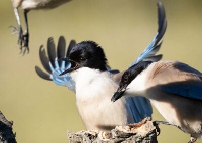 Dit keer wel een ekster maar veel kleiner dan de ekstersoort die wij kennen. De blauwe ekster is heel specifiek voor deze regio in Spanje. De hut kijkt uit op een kleine rotspartij met een vijvertje waarin de eksters regelmatig een bad nemen. Deze vogeltjes zijn razendsnel en duiken vanachter de rotspartij plotseling op. Het valt, althans mij, niet mee ze goed scherp in beeld te krijgen. Maar met een flinke dosis geluk schiet ik ook hier mooie platen.
