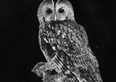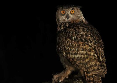 De uilenhutten zijn er voor de nachtbrakers onder ons. Voor de bosuil betekent dit om een uur of 8 in de avond vertrekken en een uurtje rijden naar de hut. Bij licht installeren we ons in de hut (vergeet de muggenspray niet) en dan maar wachten tot het donker wordt. Met een levende muis als prooi duurt het niet lang nadat de zon onder is dat de bosuil zijn entree maakt. Jose zet op het moment dat de bosuil aan zijn diner begint het licht aan waardoor we ondanks de duisternis de vogel kunnen fotograferen. Nadat de muis is opgepeuzeld verdwijnt de uil weer en even later breken wij ook op. Fantastische ervaring. Met de grote oehoe is het al niet anders. Als je geluk hebt bezoekt ook de oehoe de hut. Deze magnifieke uil is nog groter dan je misschien verwacht. Met zijn beveerde poten, feloranje ogen en oorpluimen is hij een schitterend fotomodel.