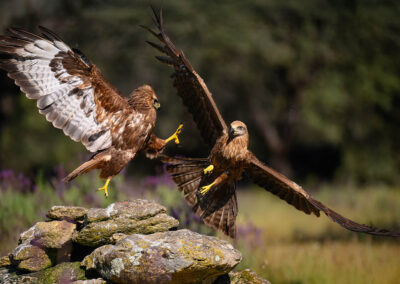 Voordat we de hut in gaan horen we de wouwen al en zien we ze vervolgens ook cirkelen. Ze weten dat er iets te eten komt. Zodra we in de hut zitten komen de vogels aanvliegen om iets van het vlees tijdens de vlucht te pakken. Later landen ze ook op de verschillende plaatsen waar vlees ligt. Dit leidt tot kleine incidenten onderling wat voor ons weer mooie actiefoto’s geeft. Zoals in onderstaande foto van Jochen tussen een buizerd en een zwarte wouw.