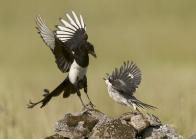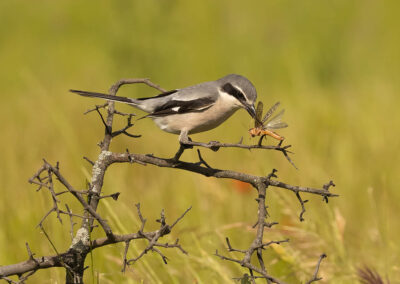 Niet alleen de roofvogels zijn leuk om vast te leggen, maar ook kleinere vogels die specifiek voor Spanje zijn staan op het programma. De Iberische klapekster is zo’n soort. Een vogel uit de familie van de klauwieren (en dus geen ekster) die zijn prooi vastpint op lange doornen. Wederom mooi geënsceneerd met een springhaan aan een doorn kunnen we de klapeksters van dichtbij fotograferen. Deze kleine vogels bieden weer een hele andere uitdaging door hun snelle acties dan de grote roofvogels. En omdat ze voor de hut foerageerden is hun gedrag veel onvoorspelbaarder dan dat van de hop en de steenuil.