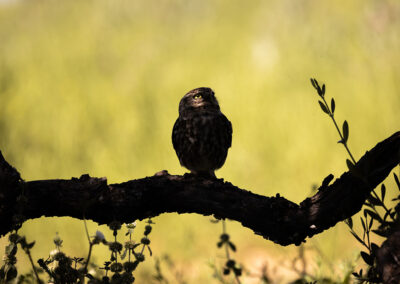 De steenuil nestelt anders dan zijn naam doet vermoeden niet tussen de rotsen maar in een hol in een oude olijfboom. In deze tijd van het jaar zijn de ouders druk met het aanvliegen van voedsel voor de jongen. Met de vogel in de holte van de boom zijn mooie grafische platen te maken. Zoals bij alle fotohutten hier is er veel aandacht besteed aan de aankleding van het zicht uit de hut. De vogel komt dus vaak aanvliegen en landt op een tak voordat hij het hol weer in gaat. Er is een goede kans dat je mooie aan- en afvlieg foto’s maakt.