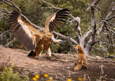 Deze hut is bijzonder spectaculair. Op een zeker moment komen er wel zo’n veertig vale gieren op de voederplaats af, waaronder ook enkele monniksgieren. Deze laatste soort behoort tot de top 10 van vogels met de grootste spanwijdte. De gieren samen met de vosjes, raven en zwarte wouwen vormen een waar spektakel. Zó veel dynamiek, je weet gewoon niet waar je moet fotograferen.